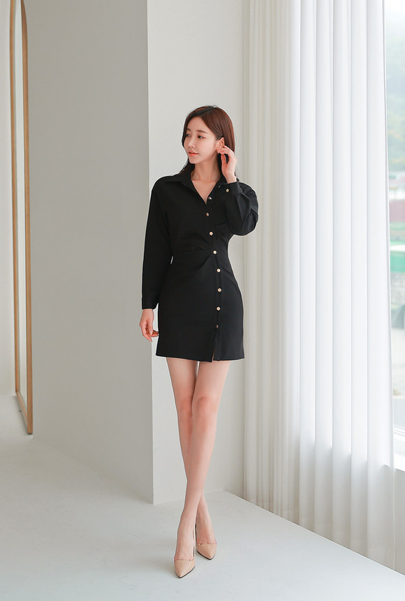 修身黑色连衣裙,完美勾勒迷人曲线。金色纽扣饰增添亮点,简约中透出精致。搭配裸色高跟鞋,拉长腿部线条,彰显高挑身姿。整体造型经典优雅,适合多种场合,展现现代女性自信风采。